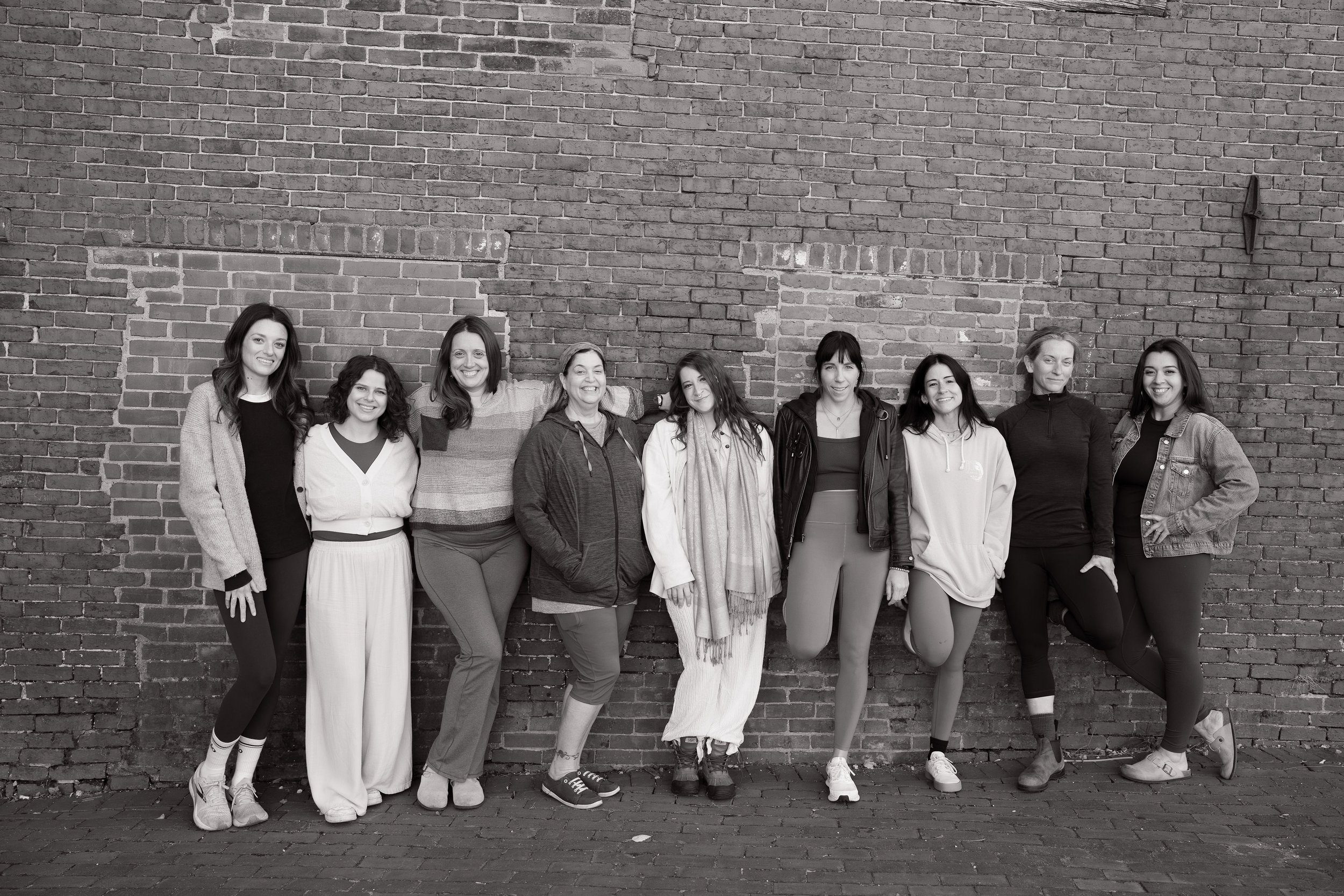 A group of nine women walking together outdoors on a cobblestone street, smiling and talking, with trees and buildings in the background.